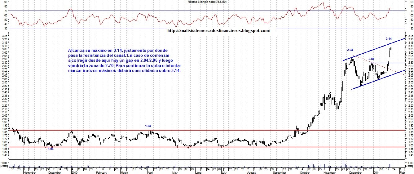 Esta haciendo un volumen impresionante a la suba, ademas recien esta cerca del precio que tuvo en el maximo de agosto del 2007 que fue 3,02.