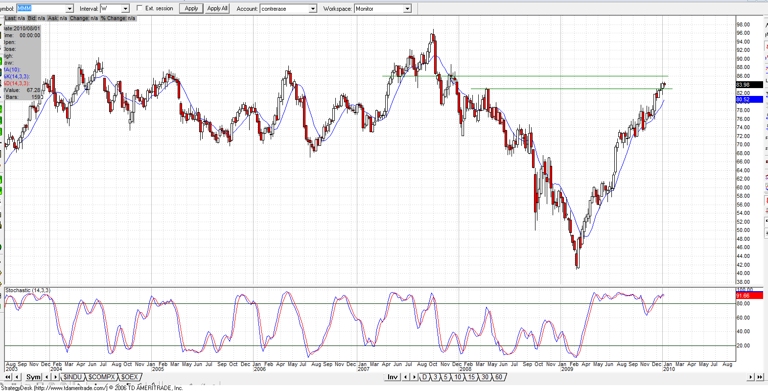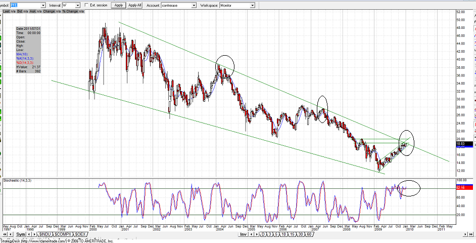 aca les dejo el analisis grafico rapido de todos los componentes del dowjones, creo que del algunos no son componentes de DIA.Estan ordenados segun la ponderacion que tienen sobre el indice de mayor a menor y lo que hago es contar cuantas empresas tienen posibilidades de entrar en toma de ganancias de aca a muy pocos dias y los que tienen posiblidades de subir y me dio que 19 pueden bajar, 9 empresas pueden subir y 2 estan al medio. Sin tener en cuenta fundamentales de cada empresa, unicamente por grafico.