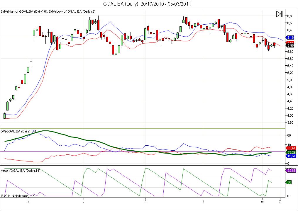 Según podemos ver el movimiento de precios sigue en una tendencia bajista ya que se posiciona por debajo del canal dinámico de medias móviles de máximos y mínimos desde el 10/02/2011, esto se encuentra confirmado por el indicador DM el mismo día donde la línea -DI cruza hacia arriba la línea +DI confirmando la dirección a la baja que da el indicador primario.El otro indicador Aroon confirma con el cruce de la línea Down a la up del indicador.