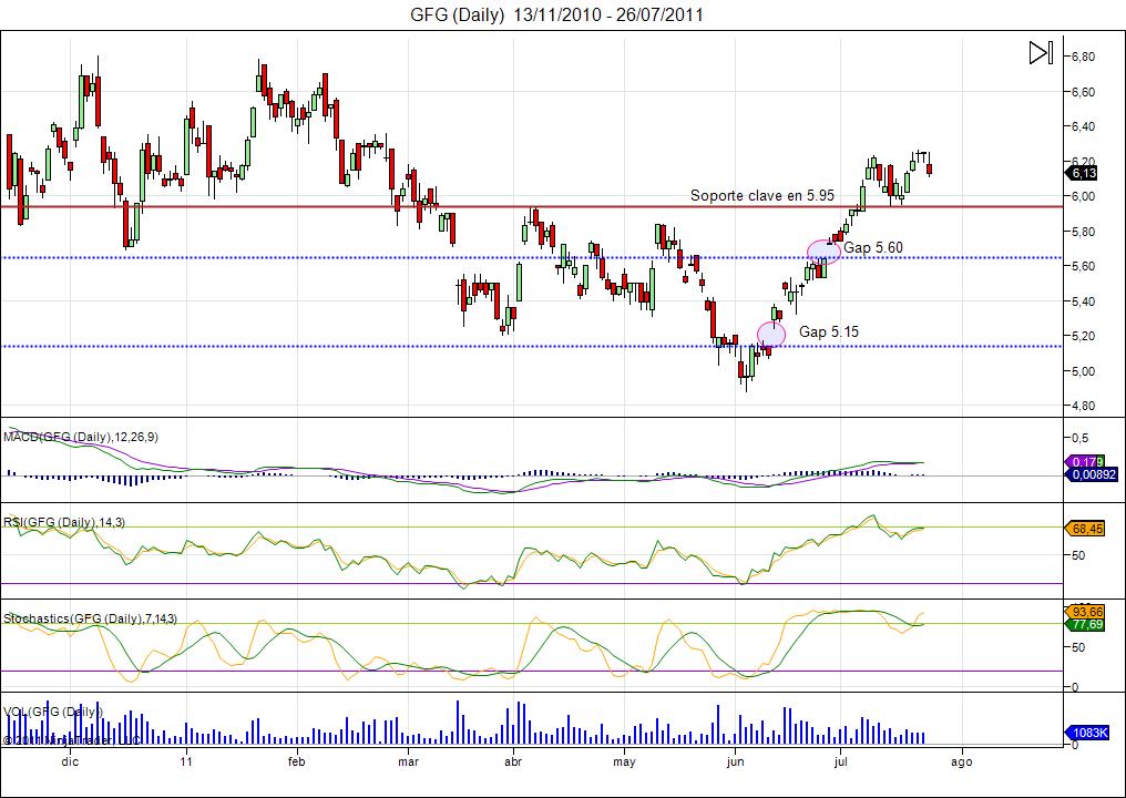 Nacho, me da como linea divisoria entre bulls y bears los 5.95, primero xq fue la zona q se testeó en la ultima baja y ademas coincide con el maximo de abril de este año. Supongo que seria una zona clave para vigilar.