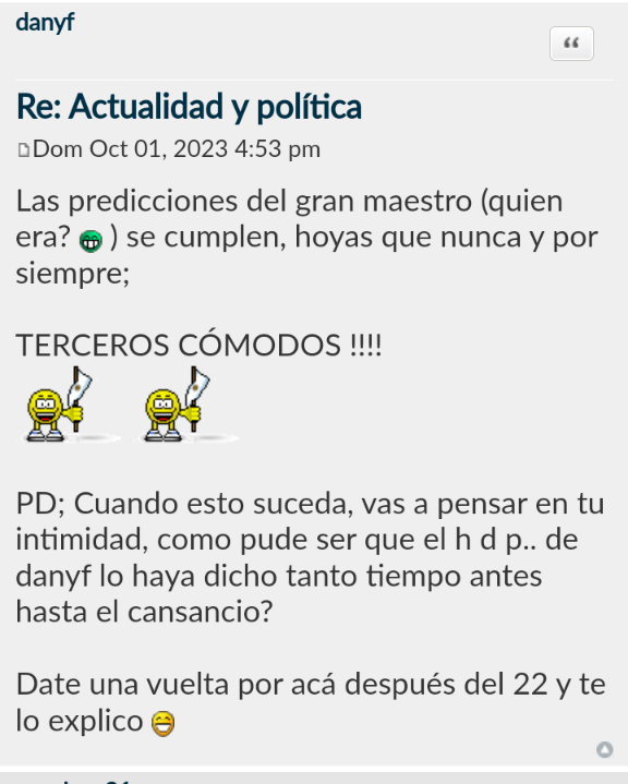 danyf escribió: ↑ Escuchame termo, las cuestiones de políticas futboleras la hacemos en otro tópic, oK?, acá la mayoría no le interesa la política y yo trato de respetar eso, ahora te lo advierto, si seguís con esta boludez en este tópic lo más probable que te comas unos cuantos baneos y no precisamente por que yo te los pida...aprende a respetar al resto que no le interesan estas discusiones futboleras.