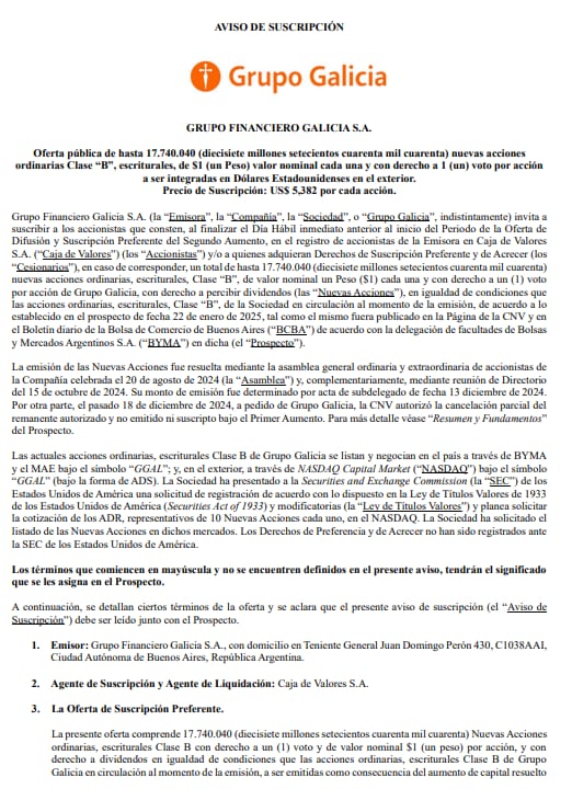Esta es la parte pertinente del prospecto q me parece q agrega más ruido a la confusión q suelen generar las suscripciones: "Únicamente se aceptará la integración de Nuevas Acciones con Dólares Estadounidenses en el exterior en la cuenta que informe el Agente de Suscripción. Los Accionistas o Cesionarios que mantengan su tenencia a través del registro escritural de Caja de Valores, deberán integrar las acciones por sí, y aquellos que mantengan sus tenencias en el depósito colectivo llevado por Caja de Valores, deberán hacerlo mediante sus respectivos Depositantes, todo ello según indique el Agente de la Suscripción en el correspondiente comunicado. No se aceptarán integraciones de las Nuevas Acciones en Dólares en Argentina y/o en Pesos y/o que no cumplan con la totalidad de los requisitos establecidos en el presente aviso y en el Prospecto. Se ruega a los señores Accionistas y/o Cesionarios revisar detenidamente la forma y plazo de integración de las Nuevas Acciones. La falta de integración de las Nuevas Acciones en las formas y plazos requeridos podrá acarrear la pérdida del derecho a suscribir las Nuevas Acciones."