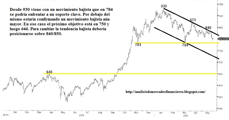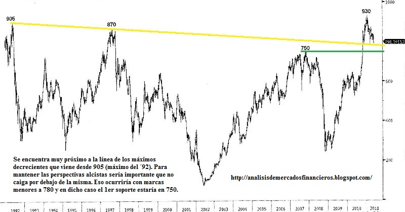Si tomamos el dolar CCL de 4,50 aprox (por la ponderacion de los cotizantes con ADRs) el Merval está en U$S 725 aprox.