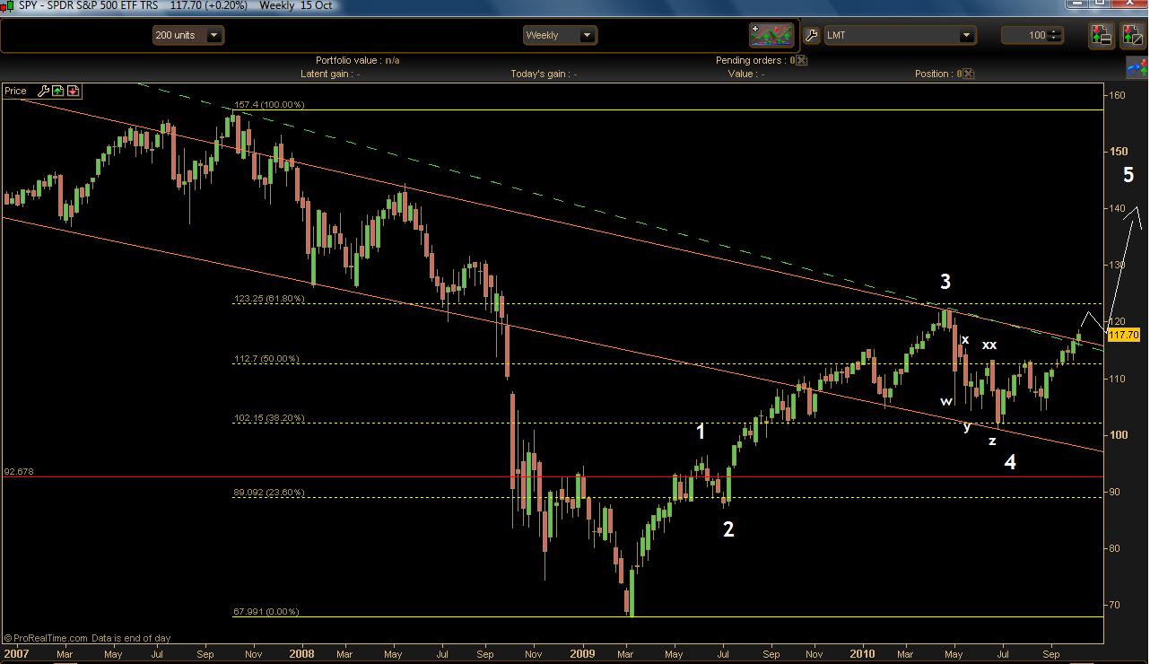 Decir que puede venir una onda 1 bajista ahora es como decir que tambien maniana puede haber un atentado en USA, que vuelen el NYSE, que hackers entren en tu compu y te afanen la guita de la cuenta, etc. Es probable, pero medio dificil desde el punto de vista tecnico con la fuerte tendencia alcista. Capaz que se te da, pero es al pe** pensar en eso por ahora: