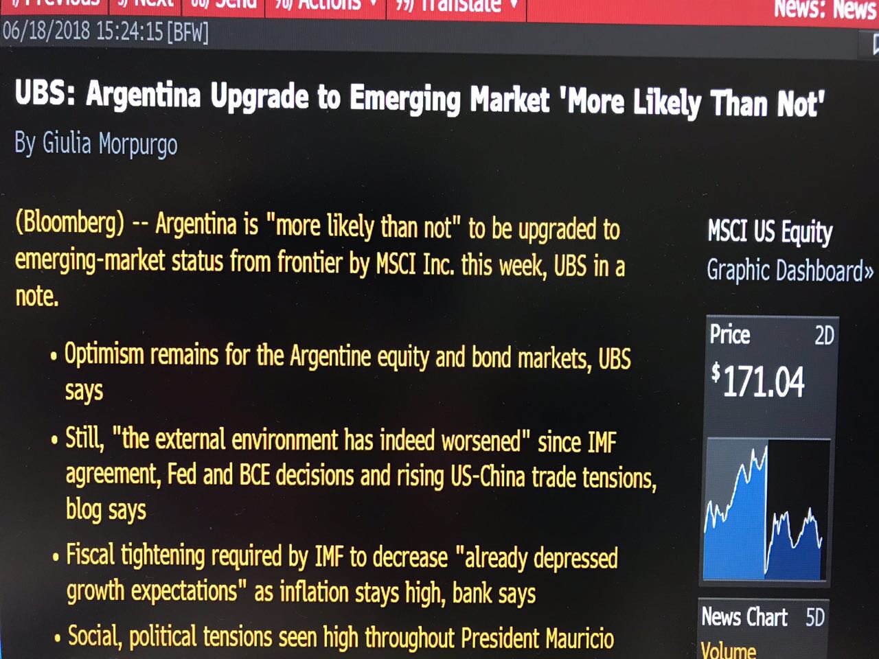 La caída en el mercado bursátil se vio agravada por un informe del diario local Clarín que indicaba que el proveedor de índices MSCI Inc. mantendría las acciones en el indicador de frontera en una decisión que se publicará esta semana. La oficina de prensa de MSCI dijo que no hará comentarios sobre la especulación y que la decisión se lanzará el 20 de junio como estaba previsto. Mientras que los indices de acciones habían estado albergando esperanzas de ascenso al mercado emergente, los analistas de Santander dijeron en una nota el lunes que la decisión está perdiendo relevancia frente a una perspectiva macro deslucida por delante.