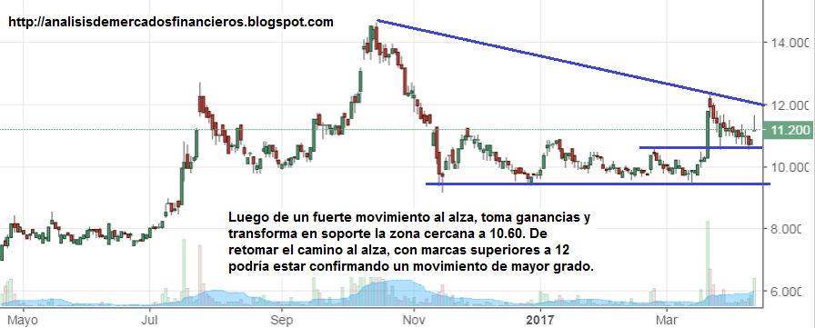 estimado bohemio .... le dejo un grafico prontito la vera al rededor de los 13 pesos (como para empezar), despues tiene el camino abierto a maximos (recuerde que el maximo esta al rededor de los $14 por el ultimo dividendo en acciones ) ...