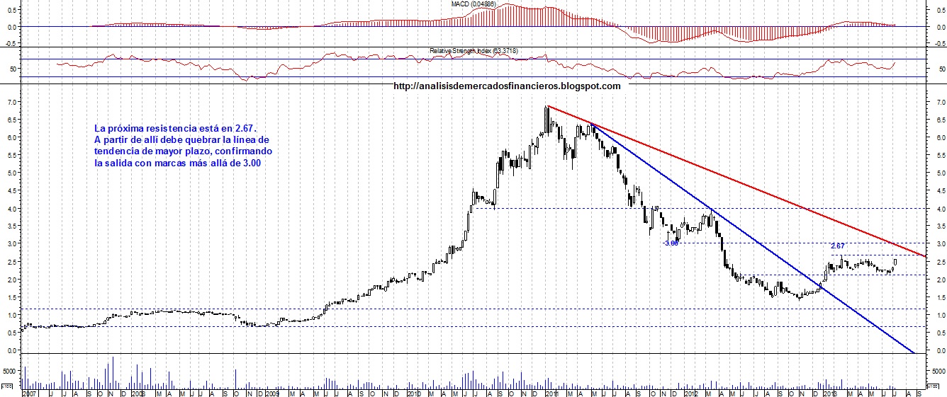 Es del blog de Análisis Técnico de Mercados, un poco viejo el análisis 08-07-13 hoy no pudo mantenerse por encima de 3 pero... puede ser útil a pesar de los avatares políticos : Gracias Harry por la respuesta